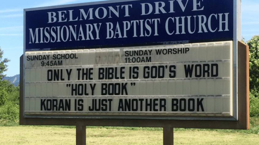 The sign in front of Belmont Drive Missionary Baptist Church changes regularly, but as of last week displayed a message on each side comparing Christianity with Islam: