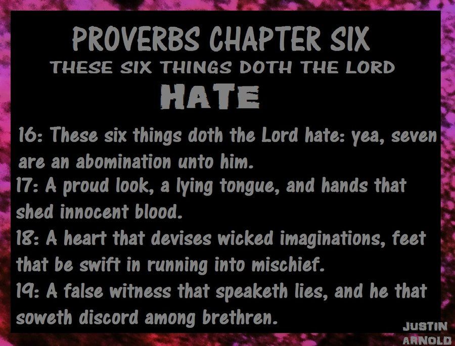 ( Proverbs 6:16-19 KJV ) “These six things doth the LORD hate: yea, seven are an Abomination unto Him: A Proud look, a Lying tongue, and Hands that shed innocent blood, An Heart that deviseth Wicked imaginations, Feet that be swift in running to mischief, A False Witness that speaketh Lies, and he that soweth discord among brethren.”!!