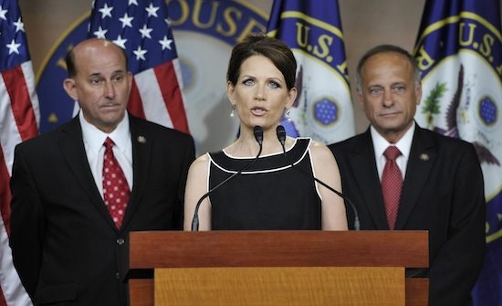 Bachmann holds a news conference with Gohmert and King to discuss the debt ceiling and military benefits, at the U.S. Capitol in Washington