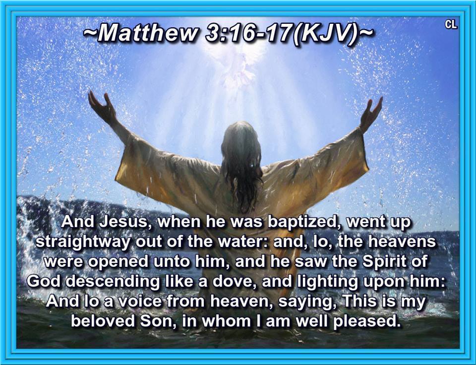 ( Matthew 3:16-17 KJV ) “And Jesus-Yeshua, when HE was Baptized, went up Straightway out of the water: and, lo, the Heavens were Opened unto HIM, and HE saw the Spirit of GOD Descending Like a Dove, and Lighting upon HIM: And lo a Voice from Heaven, Saying, This is MY Beloved SON, in whom I AM Well Pleased.” ❤ MARANATHA ❤