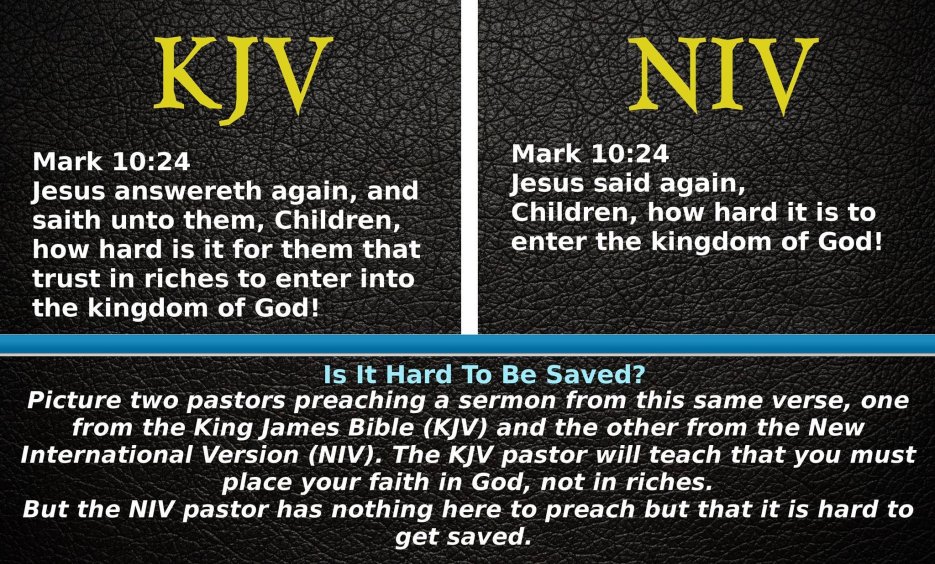 I invite you to take any new version that you wish and compare it with the King James Bible as we look at some selected portions of scripture. You are going to find that some of the most important doctrines of the Bible are being attacked in the new versions. Whether you have a Living Bible, a New International Version, a Revised Standard Version, or any of the other perversions of scripture ( including the New King James Version ), you are going to see with your own eyes that Satan is alive and well on the revision committees of the new translations. Let’s compare Bibles.