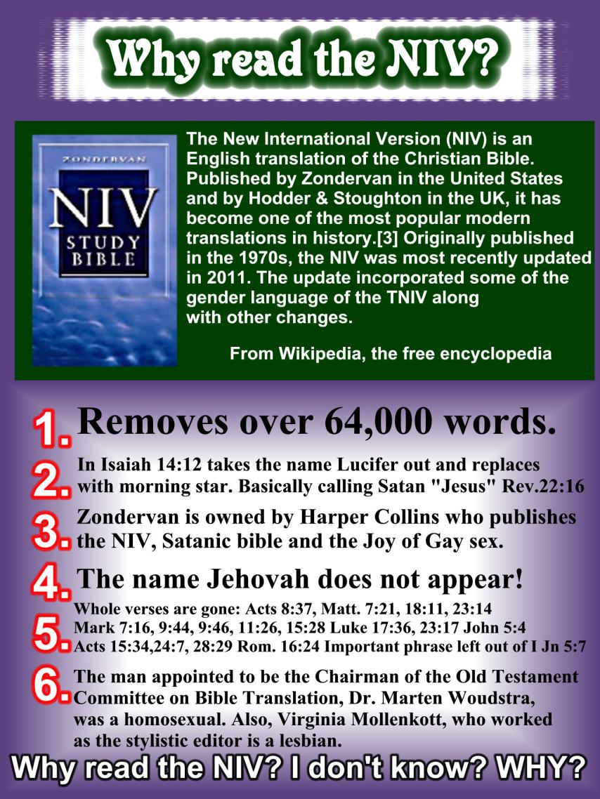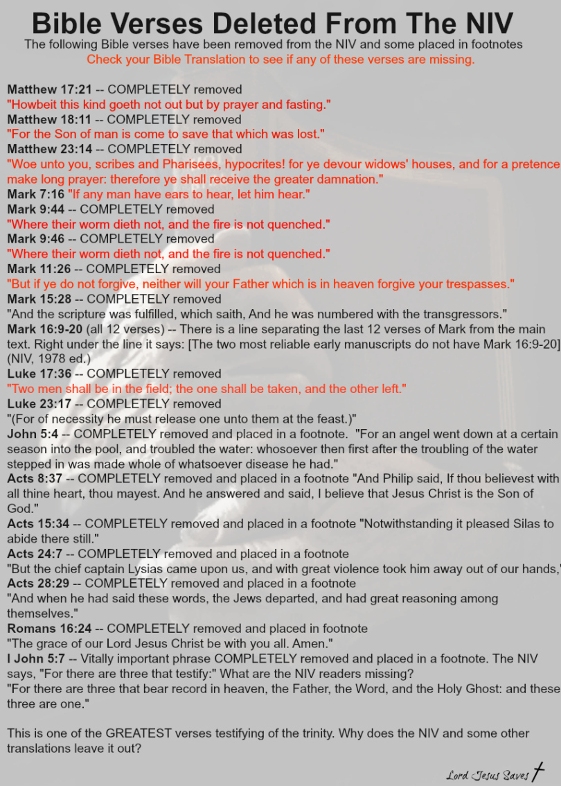 The above chart shows 10 or 12 examples of how the NIV has removed the words from the WORD of GOD. Do YOU want a bible that cuts out the holiness of GOD, removes lots of the promises, and in some cases just deletes the verse altogether?