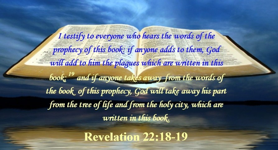 ( Revelation’s 22:18-19 KJV ) “For I testify unto every man that heareth the words of the prophecy of this book, If any man shall add unto these things, GOD shall add unto him the plagues that are written in this book: And if any man shall take away from the words of the book of this prophecy, GOD shall take away his part out of the book of life, and out of the holy city, and from the things which are written in this BOOK.”!!