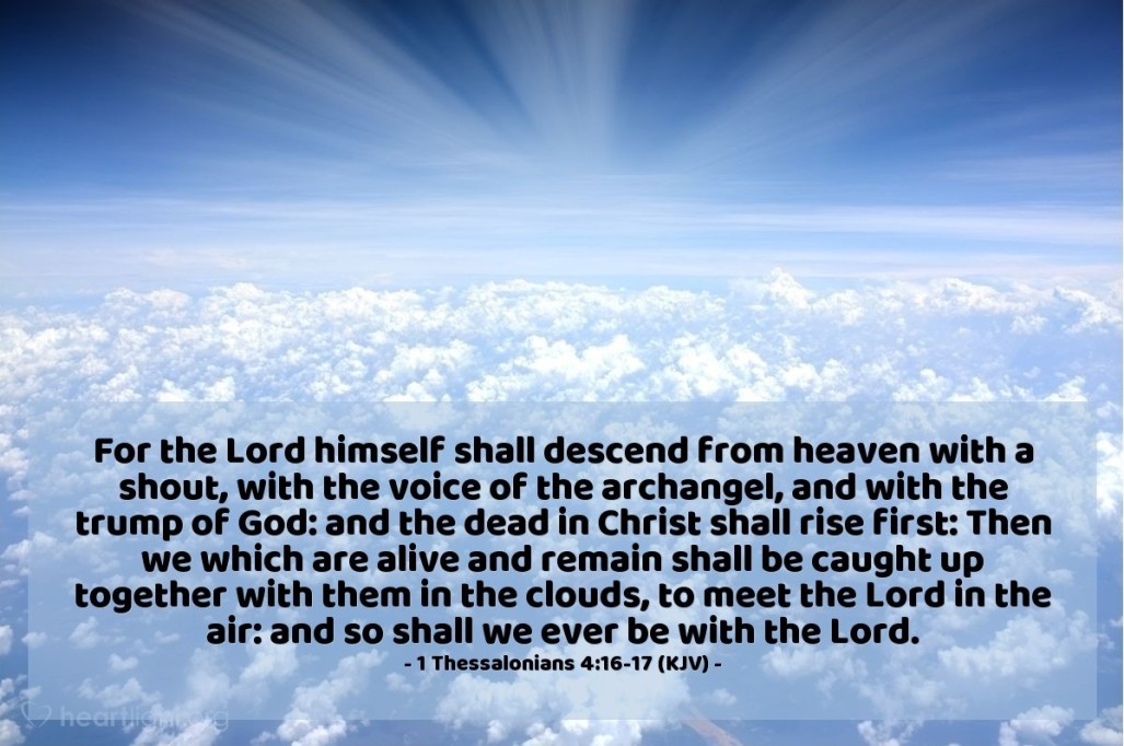 I Thessalonians 4:16-17 KJV ) “For the LORD Himself Shall Descend from Heaven with a Shout, with the Voice of the Archangel, and with the TRUMP of GOD: and the dead in CHRIST Shall Rise First: Then we which are Alive and remain shall be Caught up together with them in the Clouds, to meet the LORD in the Air: and so Shall we ever be with the LORD.”!!