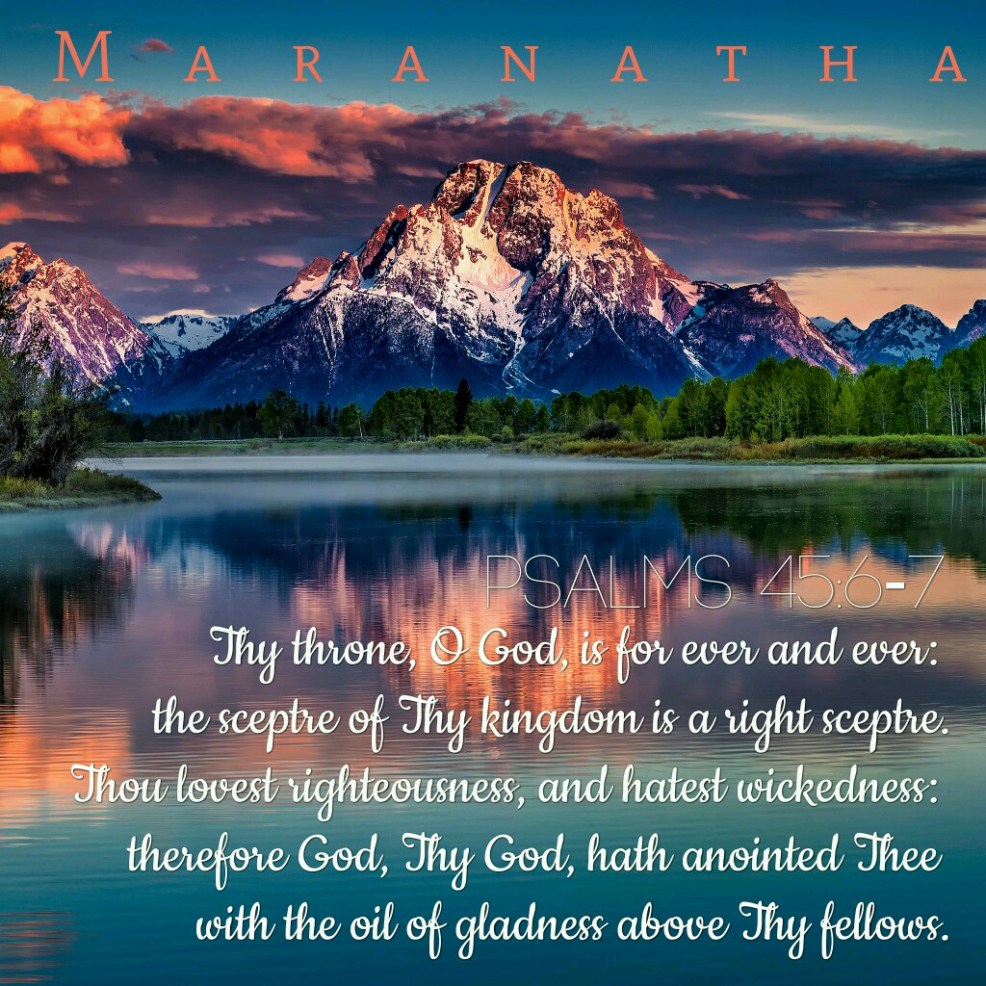 ( Psalms 45:6-7 KJV ) “Thy Throne, O GOD, is For ever and ever: the sceptre of thy Kingdom is a right sceptre. Thou Lovest Righteousness, and hatest wickedness: therefore GOD, Thy GOD, hath anointed thee with the oil of gladness above Thy fellows.”!! Hallelujah and Maranatha Amen-Amein!!
