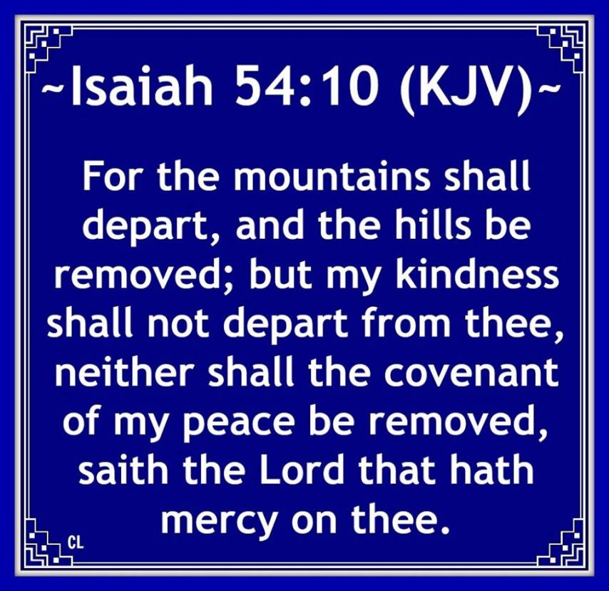 ( Isaiah 54:10 KJV ) “For the mountains shall depart, and the hills be removed; but MY Kindness shall not depart from thee, neither shall the Covenant of MY Peace be removed, Saith the LORD that hath Mercy on thee.”!!