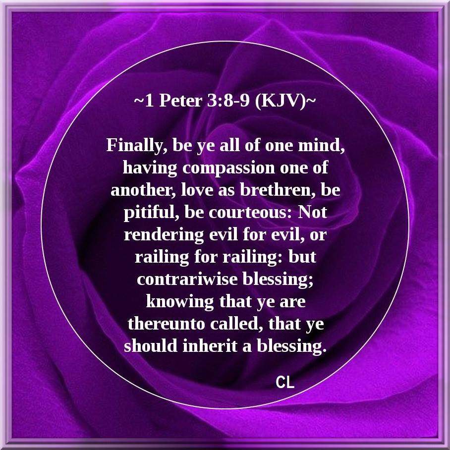 ( I Peter 3:8-9 KJV ) “Finally, be ye all of one mind, having Compassion one of another, Love as brethren, be Pitiful, be Courteous:Not rendering evil for evil, or railing for railing: but contrariwise Blessing; knowing that ye are thereunto called, that ye should inherit a Blessing.”!!
