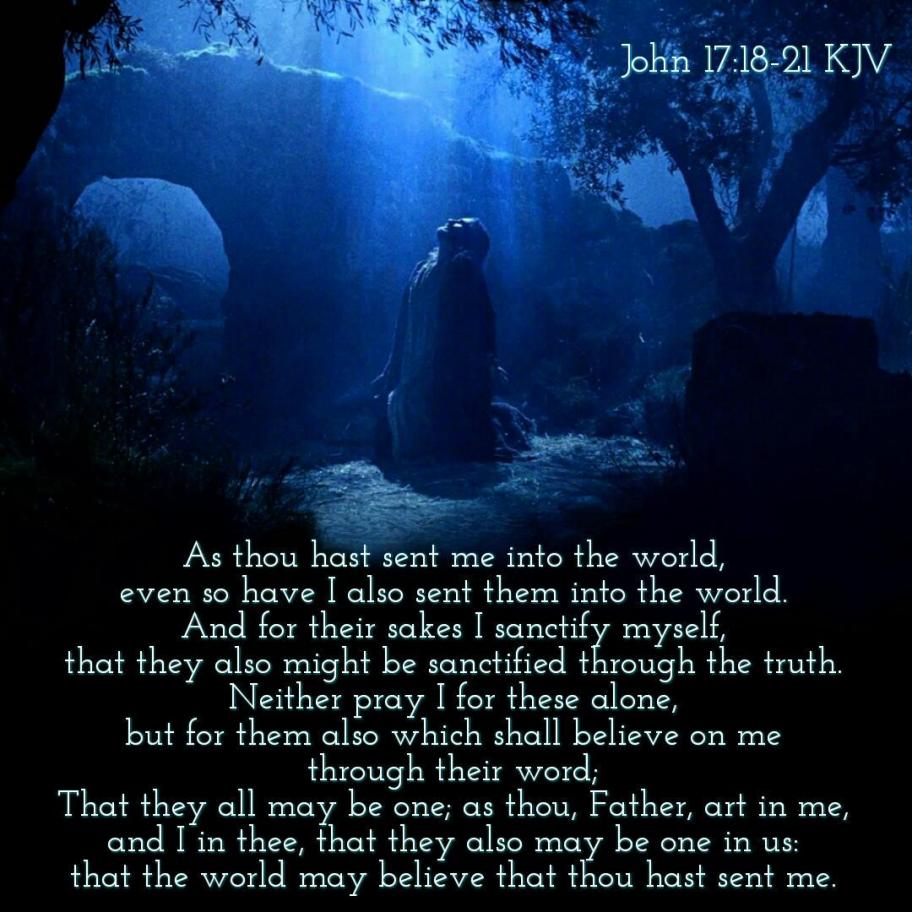 ( John 17:18-21 KJV ) “As thou hast sent ME into the world, even so have I also sent them into the world.And for their sakes I Sanctify Myself, that they also might be Sanctified through the Truth. Neither Pray I for these alone, but for them also which shall Believe on ME through their WORD; That they all may be ONE; as thou, FATHER, art in ME, and I in Thee, that they also may be ONE in US: that the world may Believe that Thou hast Sent ME.”!! TRUST JESUS-YESHUA ❤ Christ-Messiah!!
