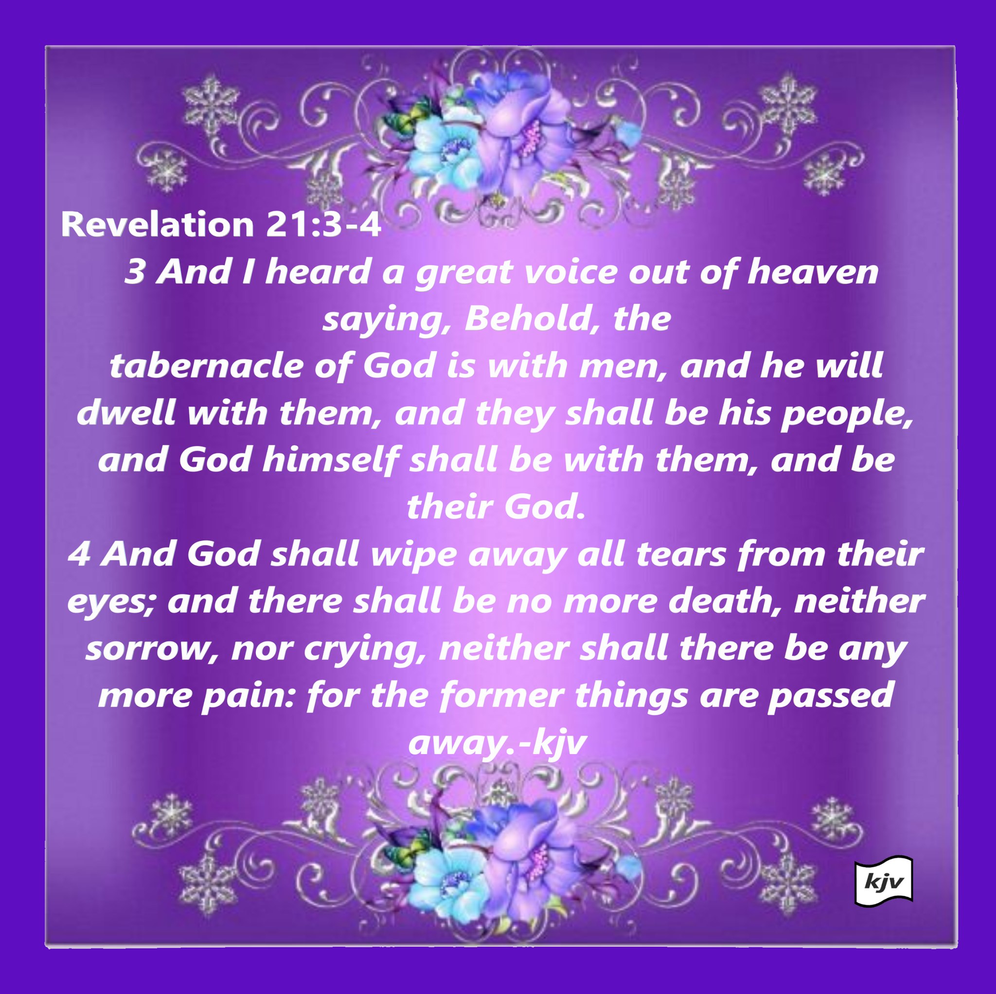 ( REVELATION 21:3-4 KJV ) “And I heard a great voice out of heaven saying, Behold, the tabernacle of GOD is with men, and he will dwell with them, and they shall be his people, and GOD Himself shall be with them, and be their GOD. And GOD shall wipe away all tears from their eyes; and there shall be no more death, neither sorrow, nor crying, neither shall there be any more pain: for the former things are passed away.”!!