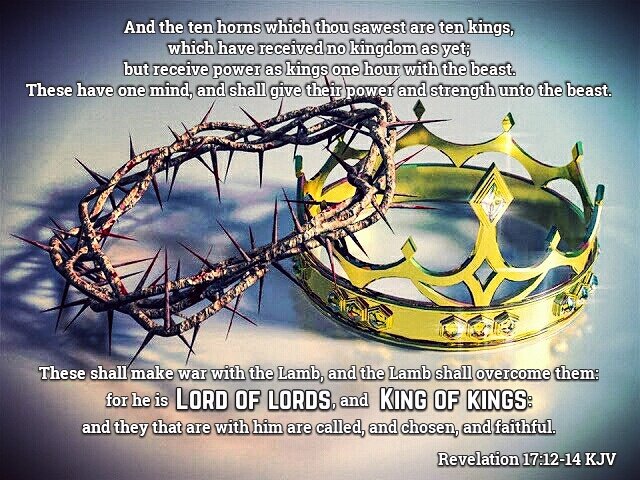 ( REVELATION 17:12-14 KJV ) “And the ten horns which thou sawest are ten kings, which have received no kingdom as yet; but receive power as kings one hour with the beast. These have one mind, and shall give their power and strength unto the beast. These shall make war with the LAMB, and the LAMB shall overcome them: for HE is LORD of lords, and KING of kings: and they that are with HIM are called, and Chosen, and Faithful.”!!
