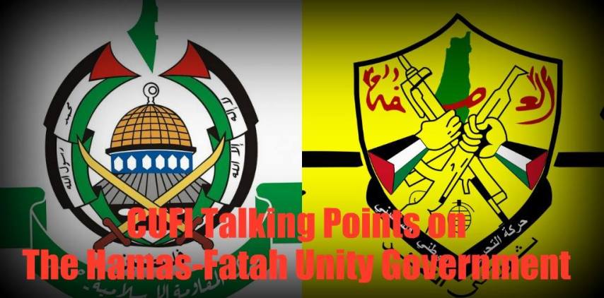 Confused about the Hamas-Fatah Unity Government? Take 30 seconds to read CUFI’s Talking Points and SHARE. Yesterday, rival Palestinian factions Fatah and Hamas announced the formation of their new national unity government. These two groups have appointed a list of interim ministers that everyone is referring to as “technocrats.” In other words, these men are bureaucrats with no blood on their hands.