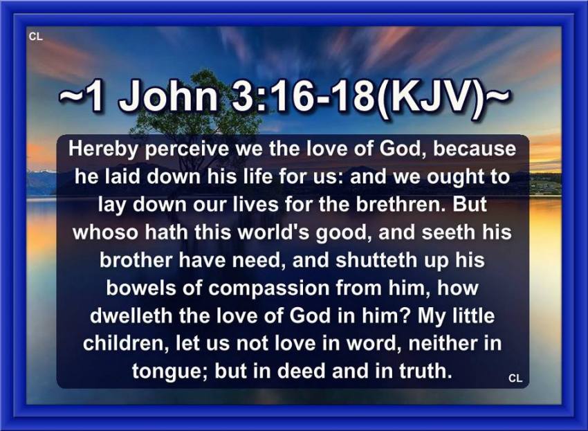 ( I John 3:16-18 KJV ) “Hereby perceive we the Love of GOD, because He Laid Down His Life for us: and we ought to lay down our lives for the brethren. But whoso hath this World’s good, and seeth his brother have need, and shutteth up his bowels of compassion from him, how dwelleth the Love of GOD in him? My little children, let us Not Love in word, neither in tongue; but in deed and in truth.”!!