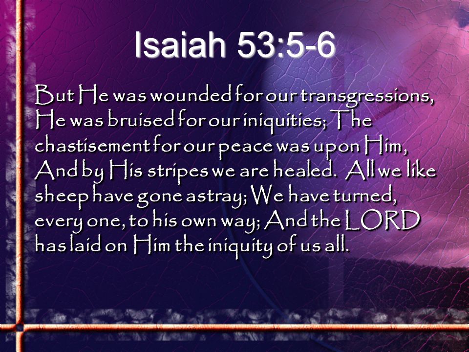 ( Isaiah 53:5-6 KJV ) “But HE ( Jesus-Yeshua ) was Wounded for our Transgressions, HE was bruised for our iniquities: the chastisement of our Peace was upon HIM; and with HIS Stripes we are Healed. All we like Sheep have gone astray; we have turned every one to his own way; and the LORD hath laid on HIM the iniquity of us all.”!!